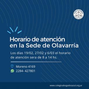 Modificaciones en el horario de atención de la subsede OlavarríaSe informa a matriculados y matriculadas que los días 19 de febrero, 27 de febrero y 3 de marzo, el personal del Colegio estará a disposición en horario reducido, de 8 a 14 hs. LEER MÁS |