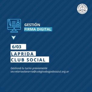 Jornada de renovación de firma digital en LapridaPersonal del Colegio viajará a la localidad el 6 de marzo para facilitar la gestión de firma digital. Se solicita a matriculados y matriculadas que necesiten renovarla que saquen turno con antelación al correo: secretariaolavarria@colegioabogadosazul.org.ar LEER MÁS |
