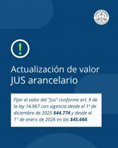 Información importante: Nueva actualización del valor del JUSSe definió mediante un nuevo acuerdo de la SCBA. Allí se establece el nuevo valor desde el 1ro de diciembre en $44.774. Además se fijó el valor del JUS desde el 1ro de enero en $45.660. LEER MÁS |