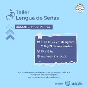 Nueva edición del taller de Lengua de SeñasEl Colegio de Abogados del Departamento Judicial de Azul en colaboración con la Facultad de Derecho de la UNICEN ha organizado un taller de lenguaje de señas, que comenzará el 3 de agosto en la sede del C.A.A. a partir de las 15 hs y estará a cargo de Emilia Zaffora. LEER MÁS |
