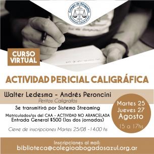 Los Peritos Calígrafos Walter Ledesma y Andrés Peroncini, brindarán esta capacitación el martes 25/08 y jueves 27/08 de 15 a 17hs, vía streaming. Se entregarán certificados de asistencia. Inscripciones hasta las 14hs del día 25/08: biblioteca@colegioabogadosazul.org.ar