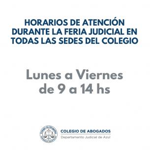 Horario de atención durante la Feria JudicialInformamos que las sedes del Colegio de Abogados Departamental, estarán a disposición de matriculadas y matriculados de lunes a viernes de 9 a 14hs. LEER MÁS |