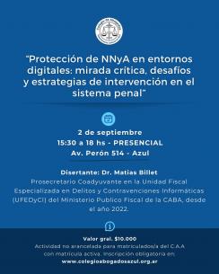 El Colegio organizó una charla sobre protección de NNyA en entornos digitalesSe trata de un encuentro que estará a cargo del Dr. Matías Billet, quien se desempeña como Prosecretario Coadyuvante de la Unidad Fiscal Especializada en Delitos y Contravenciones informáticas del Ministerio Público Fiscal de CABA. Se realizará en la Sede del Colegio el 2 de septiembre a las 15.30 hs. LEER MÁS |