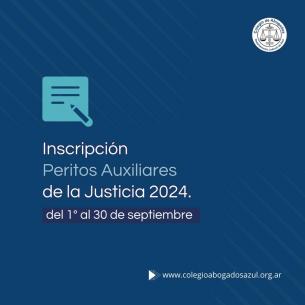 Inscripción abierta: Peritos Auxiliares de la Justicia 2024Hasta el 30 de septiembre estará abierta la inscripción para integrar el listado 2024 de Peritos de Lista (según Acuerdo Nº 2728/96 de la SCBA). LEER MÁS |