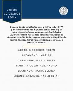 Acto de Jura de nuevas matriculadas y matriculadosEl próximo viernes 30 de mayo a las 9.30 hs, con modalidad presencial en la sede de Azul (Av. Perón 514) y transmisión vía YouTube; las autoridades del Colegio de Abogados Departamental tomarán juramento a las abogadas, abogados y procuradores cuya nómina ponemos en consideración pública. LEER MÁS |