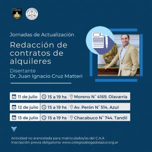 Nueva propuesta: Jornadas de Actualización en redacción de contratos de alquileresLos encuentros se desarrollarán el 11 de julio en la Subsede Olavarría del C.A.A, el 12 en el Colegio de Abogados de Azul y el 13 en la Subsede Tandil desde las 15 a las 19 hs. LEER MÁS |