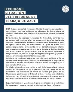 Reunión con abogados/as de distintas localidades por la situación del Tribunal de Trabajo de AzulEl miércoles por la tarde se realizó de manera híbrida una reunión convocada por el Colegio de Abogados Departamental donde se abordó la situación del Tribunal de Trabajo de Azul. LEER MÁS |