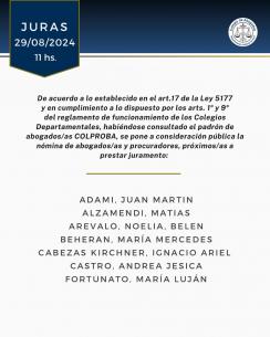 Acto de Jura de nuevas matriculadas y matriculadosEl próximo jueves 29 de agosto a las 11 hs, con modalidad presencial en la sede de Azul (Av. Perón 514) y transmisión vía YouTube; las autoridades del Colegio de Abogados Departamental tomarán juramento a las abogadas, abogados y procuradores cuya nómina ponemos en consideración pública. LEER MÁS |