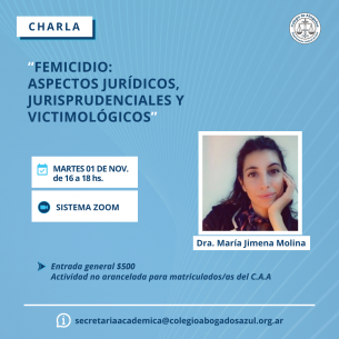 Charla: “Femicidio: aspectos jurídicos, jurisprudenciales y victimológicos”La Dra. María Jimena Molina disertará sobre esta temática el 1/11 de 16 a 18 hs, vía sistema Zoom. Esta capacitación será no arancelada para matriculados y matriculadas del C.A.A. LEER MÁS |