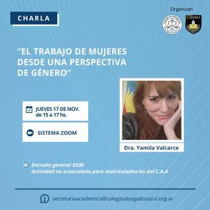 Charla: “El Trabajo de mujeres desde una perspectiva de género”La Dra. Yamila Valcarce brindará esta capacitación organizada por el Colegio de Abogados Departamental y Fundación CIJUSO, el jueves 17/11 de 15 a 17 hs, vía sistema Zoom. LEER MÁS |