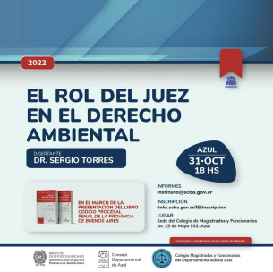 El Dr. Sergio G. Torres disertará sobre “El rol del Juez en el Derecho Ambiental”El Consejo Departamental Azul del Instituto de Estudios Judiciales de la SCBA invita a la presentación de la obra “Código Procesal Penal de la Provincia de Buenos Aires, Tomo I y II” (Ed. Hammurabi) a cargo del Dr. Sergio G. Torres, Ministro de la SCBA y actual presidente del IEJ. En este marco el Dr. Torres disertará sobre “El rol del Juez en el Derecho Ambiental”. LEER MÁS |