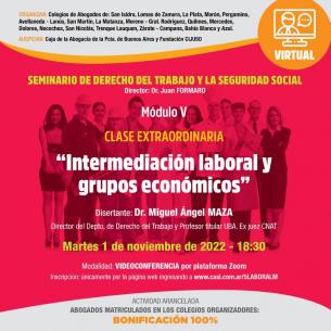 “Intermediación laboral y grupos económicos”Este módulo forma parte del Seminario de Derecho del Trabajo y la Seguridad Social y se dictará en forma virtual vía Zoom, el martes 1/11 a las 18:30. Requiere inscripción previa para participar, siendo no arancelado para matriculadas y matriculados del C.A.A. LEER MÁS |