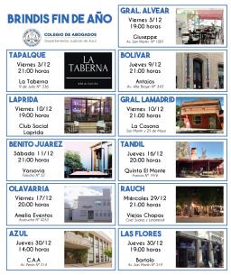 Brindis de Fin de AñoInvitamos a las matriculadas y matriculados de Azul y Las Flores a participar esta semana de los encuentros que completan el cronograma programado en todo el Departamento Judicial, para finalizar juntos este 2021. LEER MÁS |