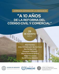 Jornada especial por la Semana de la Abogacía en el ColegioSe trata de una charla/debate a 10 años de la reforma del código civil y comercial de la que participarán importantes referentes del derecho. El evento se realizará el 29 de agosto a partir de las 9.30 hs en la sede del Colegio. LEER MÁS |