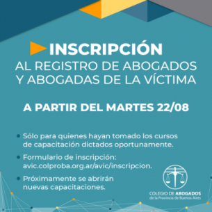 Inscripción al registro de abogados y abogadas de la víctimaEn una reunión llevada a cabo en los últimos días se perfilaron los detalles para la puesta en funcionamiento del Programa de asistencia a las víctimas de delitos en la provincia de Buenos Aires, en el marco de la ley de Víctimas 15.232. LEER MÁS |