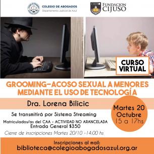 Charla: “Grooming-Acoso sexual a menores mediante el uso de tecnología”El martes 20/10 de 15 a 17hs, la Dra. Lorena Bilicic brindará esta capacitación vía streaming, organizada por Fundación CIJUSO y el Colegio de Abogados Departamental. Inscripciones hasta el martes 20/10 a las 14hs, por mail: biblioteca@colegioabogadosazul.org.ar LEER MÁS |