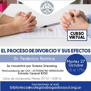 Charla: “El Proceso de Divorcio y sus efectos”El Dr. Federico Nótrica disertará sobre esta temática el martes 27/10 de 15 a 17hs, a través del sistema streaming. Podrás inscribirte hasta el 27/10 a las 14hs, enviando un mail a: biblioteca@colegioabogadosazul.org.ar LEER MÁS |