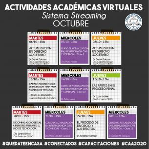 Octubre: Agenda académica de capacitaciones virtualesCompartimos la agenda de capacitaciones que se brindarán vía streaming, durante este mes. Inscripciones y consultas, por mail: biblioteca@colegioabogadosazul.org.ar LEER MÁS |