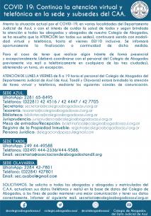 COVID 19: Hasta el 2/10 continúa la atención virtual en la sede y subsedes del CAA.Atento la situación actual por el COVID-19, en varias localidades del Departamento Judicial de Azul, y con el interés de cuidar la salud de todos y seguir brindado la atención a todas las abogadas y abogados de nuestro Colegio de Abogados, se ha resuelto que la ATENCIÓN (en todas sus sedes), continuará siendo con modalidad virtual y telefónica, hasta el viernes 2/10 inclusive. Se informará oportunamente la finalización o continuidad de dicha medida. LEER MÁS |