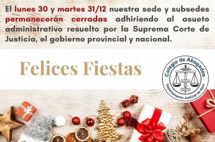 Asueto administrativo en virtud de la celebración de Año NuevoEl lunes 30 y el martes 31/12 nuestra sede y subsedes permanecerán cerradas adhiriendo al asueto administrativo resuelto por la Suprema Corte de Justicia, el gobierno provincial y nacional. LEER MÁS |