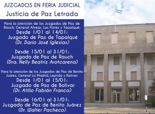 Juzgados de turno durante la Feria JudicialPonemos a disposición de matriculadas y matriculados el listado de los magistrados y organismos designados por la Suprema Corte de Justicia para atender los asuntos de urgente despacho durante este período en el Departamento Judicial de Azul. LEER MÁS |