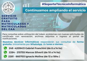 Soporte Técnico Informático gratuito para matriculadas y matriculadosEste beneficio está a disposición para que puedas consultar sobre utilización del token, problemas con nuevas solicitudes de certificado con renovación, archivos adjuntos e ingreso al portal de notificaciones. LEER MÁS |