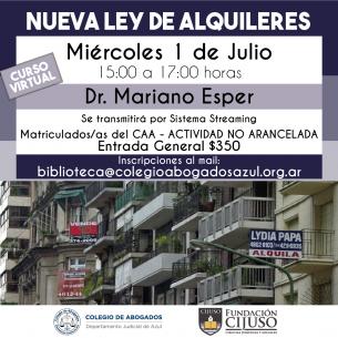 Charla: “Nueva Ley de alquileres”El miércoles 1 de Julio de 15 a 17hs, el Dr. Mariano Esper brindará esta capacitación organizada por Fundación CIJUSO y el Colegio de Abogados Departamental. Se realizará vía streaming y se entregarán certificados de asistencia. Inscripciones: biblioteca@colegioabogadosazul.org.ar LEER MÁS |