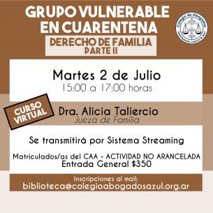Charla: Grupo vulnerable en cuarentena. Fuero de Familia. Parte IILa Jueza de Familia, Dra. Alicia Taliercio disertará sobre esta temática el jueves 2/07 de 15 a 17hs, vía streaming. Se entregarán certificados de asistencia. Inscripciones: biblioteca@colegioabogadosazul.org.ar LEER MÁS |