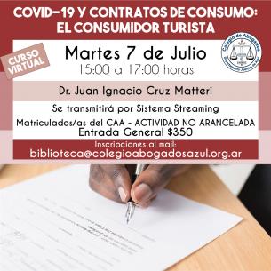Charla: COVID-19 y contratos de consumo: El Consumidor TuristaEl Dr. Juan Ignacio Cruz Matteri, destadcado especialista, disertará sobre esta temática el martes 7 de julio de 15 a 17hs, vía streaming. Se entregarán certificados de asistencia. Inscripciones: biblioteca@colegioabogadosazul.org.ar LEER MÁS |
