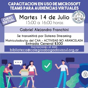 Capacitación en uso de Microsoft Team para audiencias virtualesEl Técnico en Informática Gabriel Alejandro Franchini, explicará como bajar la aplicación y como usarla: en celulares, tablets y computadoras; el martes 14/07 de 15 a 16hs, vía streaming. Inscripciones: biblioteca@colegioabogadosazul.org.ar LEER MÁS |