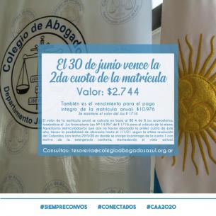 Mañana 30/06 vence la segunda cuota de la matrícula.Recordamos a nuestras matriculadas y matriculados que el próximo martes 30/06 es el vencimiento de la segunda cuota de matrícula de este año, como así también es el vencimiento para el pago íntegro de la matrícula. LEER MÁS |