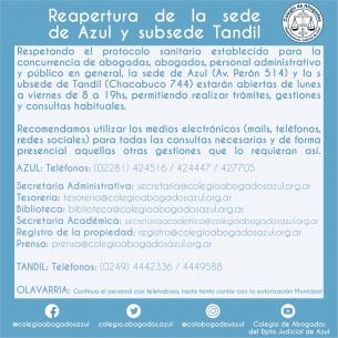 Reapertura de la sede de Azul y subsede de TandilRespetando el protocolo sanitario establecido para la concurrencia de abogadas, abogados, personal administrativo y público en general, la sede de Azul (Av. Perón 514) y la subsede de Tandil (Chacabuco 744) estarán abiertas de lunes a viernes de 8 a 19hs, permitiendo realizar trámites, gestiones y consultas habituales. LEER MÁS |