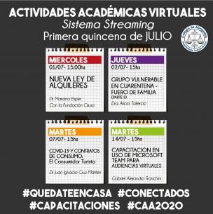 Actividades académicas virtuales durante la primera quincena de julioCompartimos la agenda de capacitaciones que se brindarán vía streaming, durante las primeras dos semanas del mes próximo. A la brevedad, publicaremos mayor información respecto de las charlas y jornadas que se dictarán en su totalidad, para que abogadas y abogados puedan aprovechar estos espacios de formación. LEER MÁS |