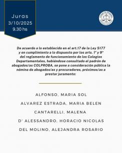 El próximo viernes 3 de octubre se realizará un nuevo acto de jura de matriculados/as en la sede de nuestro Colegio de Abogados Departamental. Desde las 9.30 hs las autoridades acompañarán a la nómina de profesionales que se pone a consideración pública.