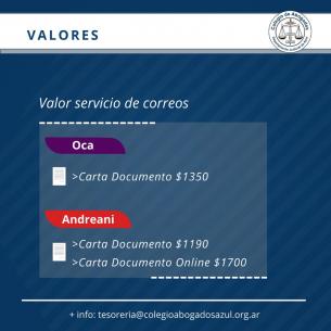 Valores vigentes para el envío de Carta DocumentoMatriculadas y matriculados tienen a disposición en Mesa de Entradas del Colegio de Abogados Departamental, los servicios de correo OCA o Andreani, de acuerdo a su preferencia. LEER MÁS |