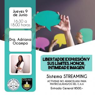 Charla: “Libertad de expresión y sus límites. Honor, Intimidad e Imagen”La Dra. Adriana Ocampo disertará sobre esta temática el jueves 9/06 de 16:30 a 18 hs, vía Sistema Streaming. Esta capacitación es no arancelada para matriculados y matriculadas del C.A.A. Se entregarán certificados de asistencia. LEER MÁS |