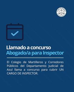 Llamado a Concurso para cubrir un cargo de InspectorEl Colegio de Martilleros y Corredores Públicos del Departamento Judicial de Azul convoca a concurso para cubrir un cargo de Inspector. Funciones: tareas de inspección y labores administrativas colegiales. LEER MÁS |