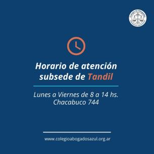 Horario de atención en la Subsede TandilSe informa a matriculados y matriculadas que hasta nuevo aviso la Subsede del Colegio de Tandil (Chacabuco 744) estará disponible para consultas en el horario de 8 a 14 hs. LEER MÁS |