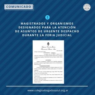 Horario de atención durante la Feria JudicialInformamos que la sede y subsedes del Colegio de Abogados Departamental, estarán a disposición de matriculadas y matriculados de lunes a viernes de 9 a 14 hs LEER MÁS |