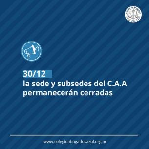 El viernes 30/12 la sede y subsedes del C.A.A permanecerán cerradas.En concordancia con las medidas adoptadas por el Poder Ejecutivo Nacional (Decreto Nº 820/22) y Provincial (Decreto Nº 2101/22), respecto del asueto administrativo dispuesto a raíz de las celebraciones de las festividades de Navidad y Año Nuevo; además de lo dispuesto en la Resolución SC Nº 3031/22 de la Suprema Corte de Justicia que implica asueto judicial con suspensión de términos procesales en todo el ámbito del Poder Judicial de la Provincia de Buenos Aires, recordamos a los matriculados y matriculadas que el 30 de diciembre tanto la sede como las subsedes del C.A.A estarán cerradas LEER MÁS |