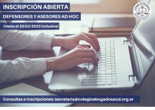 El 20/02 finaliza la inscripción al listado de Defensores y Asesores Ad HocLa/el matriculada/o deberá informar ante qué Juzgado de Paz actuará y el domicilio legal constituido ante el Colegio de Abogados del Departamento Judicial de Azul. LEER MÁS |