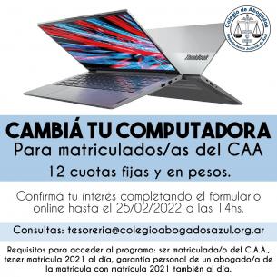 Continúa el Programa “Cambiá tu computadora”Una iniciativa del Colegio de Abogados Departamental para facilitar el acceso a la actualización tecnológica de sus matriculados y matriculadas. LEER MÁS |