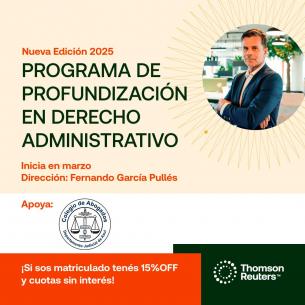 Nuevo programa de profundización en derecho administrativoEn el marco del Convenio que firmó el Colegio de Abogados Departamental con Thomson Reuters, se ofrece a matriculados y matriculadas del Colegio la posibilidad de realizar el seminario de actualización a un precio promocional. También tienen la posibilidad de abonar en hasta 3 cuotas sin interés. LEER MÁS |