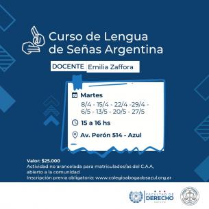 Taller de Lengua de Señas en el ColegioEl Colegio de Abogados del Departamento Judicial de Azul en colaboración con la Facultad de Derecho de la UNICEN ha organizado un taller que comenzará el 8 de abril en la sede del C.A.A. a partir de las 15 horas y estará a a cargo de Emilia Zaffora. LEER MÁS |