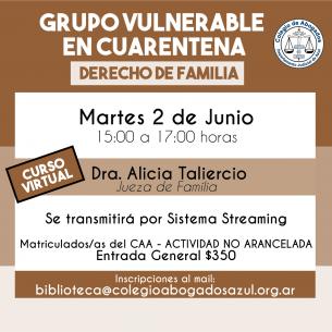 La Jueza de Familia, Dra. Alicia Taliercio, brindará esta capacitación el martes 2/06 de 15 a 17hs, vía streaming. Se entregarán certificados de asistencia. Inscripciones: biblioteca@colegioabogadosazul.org.ar