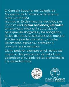 El Consejo Superior del Colegio de Abogados de la Provincia de Buenos Aires (ColProBA), reunido el 29 de mayo, ha decidido por unanimidad iniciar acciones judiciales tendientes a obtener la autorización para que las abogadas y los abogados de las distintas jurisdicciones de nuestra Provincia puedan transitar y circular libremente, ejercer su profesión y concurrir a sus estudios.