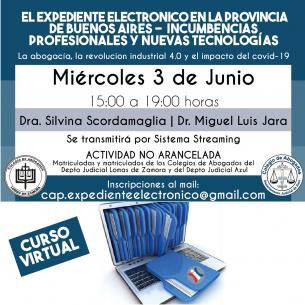 La Dra. Silvina Scordamaglia y el Dr. Miguel Luis Jara desarrollarán esta temática refiriéndose a “La abogacía, la revolución industrial 4.0 y el impacto del Covid-19”; el miércoles 3/06 de 15 a 19hs, vía streaming. La capacitación es no arancelada para matriculadas y matriculados de los Colegios de Abogados de Lomas de Zamora y del Departamento Judicial de Azul. Cupos limitados. Inscripciones: cap.expedienteelectronico@gmail.com