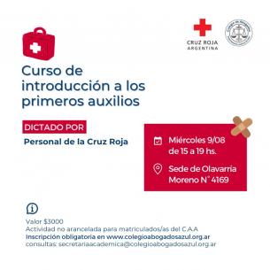 Curso de introducción a los primeros auxilios en OlavarríaEl Colegio de Abogados Departamental en colaboración con Cruz Roja Argentina, ha organizado un Curso de "Introducción a los Primeros Auxilios" que se dictará el 9 de agosto a las 15 hs en la Subsede del Colegio de Abogados en Olavarría, ubicada en Moreno 4169. LEER MÁS |