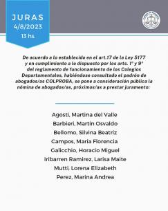 Acto de Jura de nuevas matriculadas y matriculadosEl viernes 4 de agosto a las 13 hs, con modalidad presencial en la sede de Azul (Av. Perón 514) y transmisión vía YouTube; las autoridades del Colegio de Abogados Departamental tomarán juramento a las abogadas y abogados cuya nómina ponemos en consideración pública. LEER MÁS |