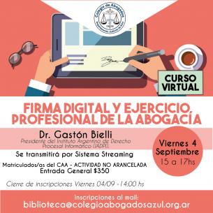 Charla: “Firma Digital y ejercicio profesional de la abogacía”.El Dr. Gastón Bielli, Presidente del Instituto Argentino de Derecho Procesal Informático (IADPI) disertará sobre esta temática el viernes 4/09 de 15 a 17h, vía streaming. Inscripción hasta las 14:00 hs del día 04/09, por mail: biblioteca@colegioabogados azul.org.ar LEER MÁS |
